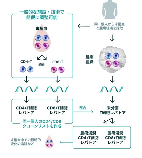 This duplicate clone analysis technology allows for easy analysis of changes in tumor-reactive CD4+ and CD8+ T-cell clones before and after treatment or over time.
